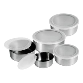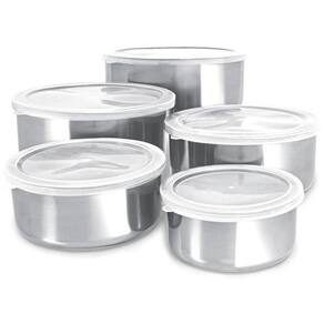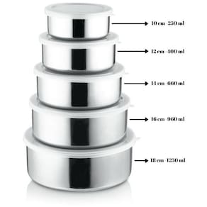 Tigelas Aço Inox 5 Peças Com Tampa Resistente Com o nosso conjunto de potes em aço inox, a sua cozinha fica mais elegância e pratica. além do seu design moderno e sua versatilidade, é fácil de limpar e muito durável. ideal para levar saladas, massas, guarnições e molhos à sua mesa com mais estilo e qualidade. as tampas em silicone facilita a identificação, aumenta a vedação e a durabilidade dos ingredientes. recomendações para aumentar a durabilidade do seu pote: Utilizar somente esponja macia, a fim de não riscar ou prejudicar o brilho do produto. Enxaguar bem as peças e sempre que possível, utilizar água quente, pois renova o brilho do produto. suas dimensões são: Altura 4,5 cm x Diâmetro 10 cm - 250 ml Altura 5 cm x Diâmetro 12 cm - 400 ml Altura 6 cm x Diâmetro 14 cm - 660 ml Altura 6,5 cm x Diâmetro 16 cm - 960 ml Altura 7 cm x Diâmetro 18 cm - 1250 ml Marca: Fullcommerce