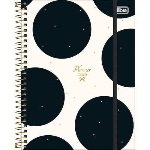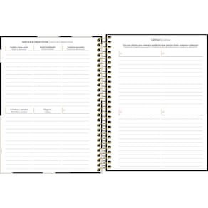 - Capa: dura. - Capa acabamento: com detalhe metalizado. - Conteúdo: Controle financeiro, Listas, Metas e objetivos e Página para planejamento do futuro. - Cor: diversas. - Espiral: Colorido. - Fechamento: com elástico. - Folhas: para anotações. - Formato: 177mm x 240mm. - Gramatura: 63 g/m². - Material: Capa Dura Com Acabamento Metalizado. - Número de folhas: 80 folhas. - Parte interna da capa decorada: Sim. - Produto certificado: FSC. - Visão: anual, mensal e semanal.