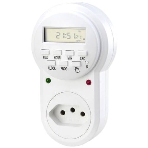 O Temporizador Digital foi desenvolvido para ligar e desligar automaticamente aparelhos elétricos com horários programados. Com display de cristal líquido e de fácil instalação, basta ligar na tomada da rede elétrica em 110V ou 220V.