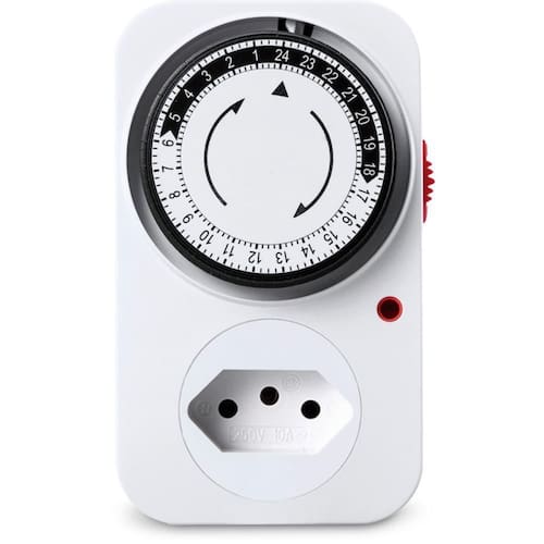 Timer analógico = é um relógio de tomada ou quadro de energia que você gira o botão e programa os horários. Não é digital, é de ponteiro mesmo. 10a = aguenta até 10 amperes de corrente elétrica. Pra coisas de baixa potência tá tranquilo como iluminação, ventiladores, etc. . 2p + T = quer dizer: 2p = Dois polos Fase e neutro. Ou seja, ele desliga/aciona os dois fios principais de energia. +t = mais Terra Tem um borne terminal também pro fio terra. Isso é importante pra segurança, principalmente em instalações que exigem aterramento. Marca: Não Informado