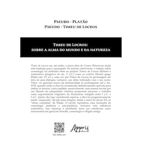 Timeu de Locros era, até então, a única obra do Corpus Platonicum ainda sem tradução para o português. De autoria controversa, o tratado sobre cosmologia foi atribuído tanto ao próprio Timeu de Locros (filósofo e matemático pitagórico do séc. V a.C.) como ao notório filósofo grego Platão (séc. IV a.C.), uma vez que Timeu de Locros foi personagem em dois de seus diálogos, inclusive, um deles intitulado com o seu nome: Timeu. As querelas acerca da autenticidade se prolongaram até o séc. XVII, quando então a obra foi considerada definitivamente apócrifa para ambos os autores, como também, possivelmente, nem mesmo escrita por um filósofo da antiguidade. Estudos posteriores situaram o trabalho como supostamente originário da Alexandria, redigido entre I a.C. e I d.C. Assim, tão logo considerada espúria, a obra foi progressivamente sendo "esquecida", até não mais integrar, desde o início do século XX, as "obras completas" de Platão. O escrito representa uma retomada da cosmologia platônica e pós-platônica, inclusive com influência aristotélica, cujo interesse é partilhado tanto por estudiosos como interessados em geral em filosofia, cosmologia e religião antiga.