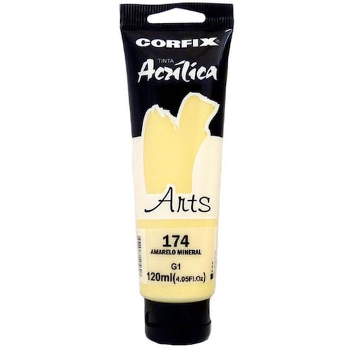 Tinta Acrílica Arts Amarelo Mineral 174 120ml Especificações: Marca: Corfix Linha: Arts Quantidade: 120ml Por Tubo Informações Adicionais: A Tinta Acrílica Arts possui um acabamento uniforme e acetinado, o qual é o preferido pela maioria dos artistas que trabalham com acrílico. Após secagem, apresenta uma película elástica e extremamente resistente aos vários suportes. Esta linha de tinta acrílica disponibiliza cores essenciais à paleta básica, as quais não se consegue com mesclas, passando por cores formuladas a partir de pigmentos de qualidade para artistas. Ficha técnica - É à prova d'água: Não - Superfícies recomendadas: Tela - Cor principal: Amarelo - Tipo de embalagem: Tubo - Set: Não - Quantidade de unidades: 1 - cor: amarelo Marca: Não Informado