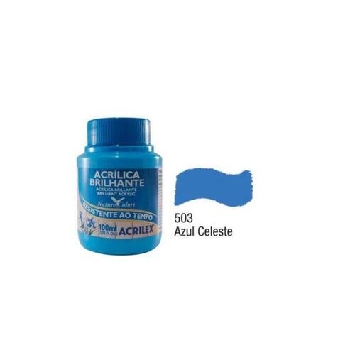 Tinta Acrílica Brilhante Azul Celeste 503 Acrilex 100Ml Tinta Acrílica Brilhante Acrilex 100ml Resistente ao tempo sol e chuva . Ideal para ser aplicada sobre: madeira, cerâmica, gesso, isopor, cortiça, couro, vidro e plásticos jateados, alumínio, latão e zinco, sempre com fins decorativos. Apresentada em 20 cores miscíveis entre si, possui acabamento brilhante, não havendo necessidade de aplicação de verniz. Caso seja diluída, pode perder o brilho. Nesse caso, é necessário aplicar mais de uma camada de tinta para obter o resultado desejado. Fabricante: Acrilex