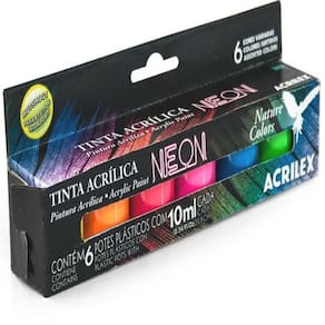 Tinta Acrílica Neon Nature Colors com 6 cores rosa, pink, amarelo, laranja, azul e verde 10ml cada Acrilex CARACTERÍSTICAS Para pintura sobre madeira, papel, cerâmica, isopor, couro e cortiça. Cores miscíveis entre si. Não tóxica. Efeito Neon sob efeito da Luz Negra.