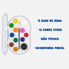 - 12 cores vibrantes que oferecem uma ampla gama versátil. - Realçe cada traço com um acabamento luminoso e vibrante. - Organize suas paletas e misture as tonalidades conforme sua inspiração. - A embalagem se transforma em um godê funcional. Basta utilizar a parte interna da tampa. - Acompanha um pincel de qualidade. - Priorizando sua segurança, este produto é não tóxico. - Pastilha de tinta solúveis em água.