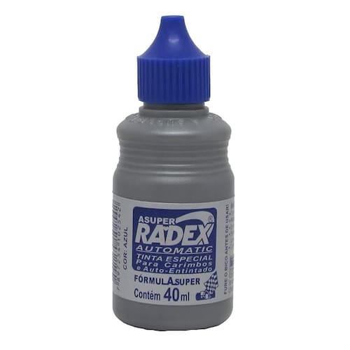 Tinta para Carimbo Automatic Azul Radex 40ml Cx 12un Descrição - Tinta para carimbo auto-entintado. - Quando seu carimbo estiver falhando, retire o refil e adicione uma gota da tinta Automatic sobre o tecido. É suficiente para reativar o funcionamento do mesmo. - Automatic é a tinta de tecnologia avançada de última geração. É ideal para reativar todos os modelos de carimbos auto-entintados. - Composição da tinta: água, glicerina, corantes, glicóis e aditivos. - Conteúdo: 40ml. - Cor: azul. - Caixa com 12 un.