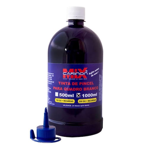 Tinta de pincel para quadro branco, reabastece todas as marcas e modelos. Marca: Carinon MixO produto: - Não mancha os quadros,- Fácil remoção,- Cores fortes e vivas para melhor visualização,- Frasco com bico aplicador para facilitar a injeção nos refis e pincéis,- 200 recargas.Ideal para: Uso comercial, escolar. Para pincel marcador de quadro branco.Dimensões: Compr. 160 mm - Larg. 95 mm - Diâm. 290 mm.Embalagem: 1 unidade de 1 litroCor: Azul