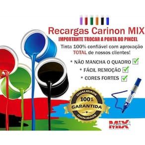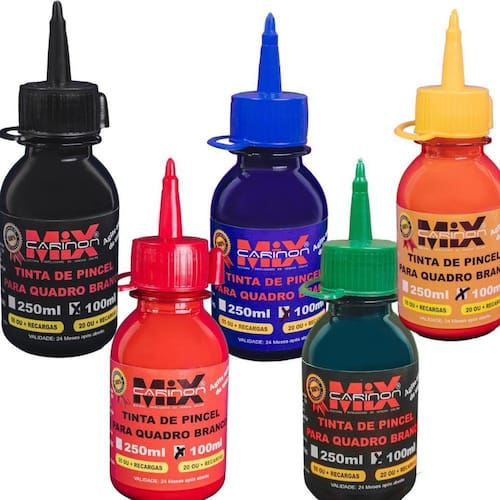 Tinta para pincel de quadro brancoEnvio em 24 horas5 frascos de 100 ml cadaTinta especial para pincéis de quadro branco de todas as marcas e modelos - não mancha os quadros;- fácil remoção;- cores fortes e vivas para melhor visualização;- frasco com bico aplicador para facilitar a injeção nos refis e pincéis.-não mancha o quadroValor referente a 5 frascos de 100 ml+ bico aplicador+ de 20 recargasTemos nas cores: azul, vermelho, verde, preto, laranjaMarca: carinon mix