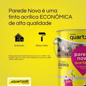 Descrição:Parede nova quartzolit é uma tinta acrílica econômica de alta qualidade, de acabamento fosco. Indicação:Indicado para pintura de superfícies internas de reboco, massa acrílica, texturas, concretos, fibrocimento, massa corrida, gesso e drywall.