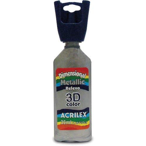 Tinta Relevo Metálica Dimensional Prata 35Ml Tinta Dimensional Relevo 3D Metálica. Aplique diretamente com o bico aplicador sobre a superfície a ser trabalhada. Utilizar tecidos 100% algodão e sem goma. Aguardar 72 horas para lavagem, após a aplicação do produto. Pode ser aplicada em telas, pintadas com tintas acrílicas para tela. Não pode ser aplicada em tecidos sintéticos ou engomados. Possui efeito relevo em qualquer tipo de material poroso e aderente, como tecidos de algodão, madeira, cerâmica, gesso, papel, papelão, isopor. Secagem em 24 horas. Cor: Prata
