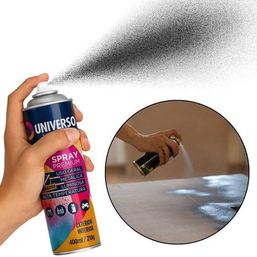Tinta Spray 400ml Preto Brilhante Uso Geral em Aço Ferro Couro Gesso Cerâmica A Tinta Spray 400ml Preto Brilhante Uso Geral é a solução prática para renovar superfícies de metal, gesso, couro e cerâmica. Ideal para dar vida nova a bicicletas, móveis, eletrodomésticos e objetos em geral, garantindo um acabamento moderno e duradouro. Com fórmula de alta qualidade, oferece excelente aderência e acabamento Brilhante, além de resistência superior contra desgastes do dia a dia. Sua cobertura uniforme realça os detalhes e proporciona um resultado em poucas camadas. Prática e fácil de aplicar, a tinta spray seca ao toque em apenas 15 minutos, permitindo agilidade nos trabalhos e economia de tempo. O rendimento de até 2 m por demão garante maior aproveitamento do produto e ótimo custo-benefício. Diferenciais: Acabamento Brilhante com ótima aderência Alta durabilidade e resistência em ambientes internos e externos Secagem rápida e aplicação prática com cobertura uniforme Especificações TÉCNICAS: Volume: 400ml Rendimento: até 2 m por demão Superfícies indicadas: metal, gesso, couro e cerâmica Secagem: toque em 15 minutos Acabamento: Brilhante Recomendação: uso de primer para melhor desempenho Itens INCLUSOS: 01 Tinta Spray 400ml Preto Brilhante Uso Geral