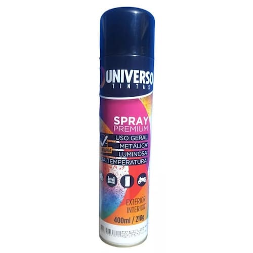 Descrição: Universo Spray Premium Uso Geral é uma tinta spray para aplicação em superfícies de metal (aço e ferro), gesso e cerâmica. Indicada para pintura de geladeiras, bicicletas, móveis de aço, brinquedos, objetos artesanais e decoração em geral, em ambientes externos e internos. Possui acabamento brilhante, ótima aderência, secagem rápida com excelente durabilidade e resistência. Composição: Resina acrílica, resina hidrocarbônica, pigmentos, solventes, aditivos e gás propelente butano e propano. Secagem: Ao toque: 15 minutos, Manuseio: 1 hora, Final: 24 h. Rendimento: Até 2m² / demão / embalagem Marca: UNIVERSO Ean: 7891696037738