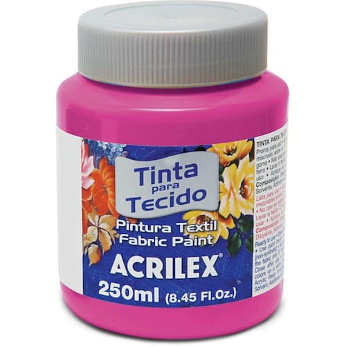 Tinta para Tecido Acrilex Fosca 250ml. Tintas à base de resina acrílica, não tóxicas e solúveis em água. Prontas para uso. São resistentes a lavagens e todas as cores são miscíveis entre si. Sua aplicação pode ser feita com pincel ou esponja, e têm fixação a frio. São tintas desenvolvidas para tecidos de fibras naturais de algodão, não devendo ser utilizadas sobre tecidos sintéticos ou engomados. Apresentada em 123 cores Foscas (incluindo o Clareador 500).