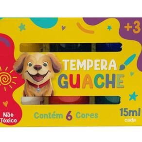 Kit estojos com guache inclui 6 cores vibrantes, cada uma com 15 ml, ideal para crianças de todas as idades.