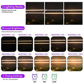 RWNTAO A luz LED Grow Light adota um design de espectro completo, que é um espectro que simula a luz solar. Este espectro completo fornece a fonte de luz mais completa para o crescimento das plantas, assim como a luz solar, permitindo que as plantas cresçam mais naturais, mais brilhantes e mais luxuosas. - ?Espectro total?Igual à luz solar natural. Foi comprovado que promove a fotossíntese e o crescimento de plantas internas, para que você não precise se preocupar que as plantas domésticas não possam crescer de forma saudável sem luz solar. - ?Liga/desliga automático e função de temporização?Você pode definir o tempo de iluminação da lâmpada de crescimento para 2/4/8 horas, dependendo dos requisitos de iluminação da planta. A luz de crescimento desligará e acenderá automaticamente ao mesmo tempo no dia seguinte, proporcionando conveniência sem operação manual - ?Segurança do material e fácil instalação?Todo material de alumínio, forte resistência à corrosão, difícil de derreter, base de grampo antiderrapante, conveniente para fixar a posição e fácil de usar. O pacote de barra de luz de cultivo vem com parafusos, abraçadeiras e fitas dupla face. O design compacto serve para vários acessórios e superfícies. O cabo de alimentação tem 198 cm de comprimento para facilitar o uso no escritório, interior, prateleira de plantas, estufa, etc - ?4 níveis reguláveis?Quatro níveis de brilho ajustável podem atender às necessidades de luz de suas plantas em diferentes estágios, mas também de acordo com a luz ao redor da planta para ajustar. Permite que suas plantas cresçam rapidamente e de forma saudável. Potência de 20 W pode economizar mais energia. - ?utilizado para plantas diferentes?Pode ser utilizado em uma variedade de flores, legumes, frutas e suculentas. Ajuda a prolongar o tempo de floração, promove a germinação e a floração das plantas, promove o amadurecimento e a doçura de frutas e vegetais e promove o crescimento saudável e a longo prazo de suculentas.