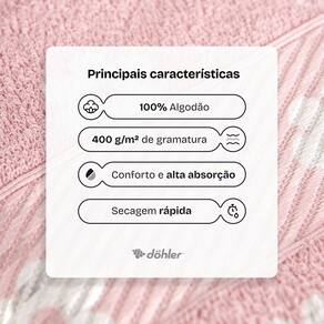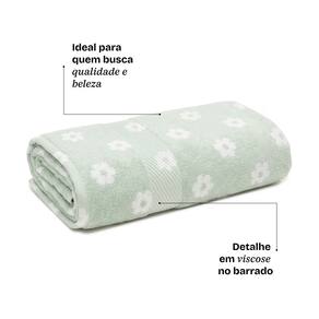 100% algodao: fibras naturais que proporcionam conforto Gramatura 400 g/m²: espessura ideal para toque macio e secagem eficiente Alta absorcao: seca a pele com sensacao de abraço no pos banho Detalhe em viscose no barrado: brilho sutil e toque acetinado Diversas estampas: mais estilo para a decoracao do banheiro Toque macio prolongado apos as lavagens