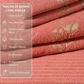 A toalha de banho Lyon da Cavhome é inspirada na sofisticação francesa e criada para proporcionar uma experiência única. Com tamanho generoso e confeccionada em 100% algodão de fibras longas e fio de dupla torção, garante toque aveludado e absorção excepcional. Seu barrado em poliéster metalizado, nos tons cobre e dourado, valoriza o delicado desenho floral em jacquard, um verdadeiro trabalho artístico. Intensamente perfumada e finalizada com amaciante hidrófilo, envolve o corpo com suavidade e conforto após o banho, transformando esse momento em puro prazer.