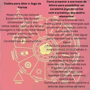 A Toalha Tecido Jogo de Cartas Cigana da Bialluz são ótimas para te auxiliar durante o jogo de cartas, por ser um elemento que proporciona alta elevação enérgica. Você também pode usar para decorar seu altar, com certeza ficara ainda mais lindo e com muita energia positiva. Nossa toalha possui altíssima qualidade na impressão com pontos de brilho e é confeccionada em tecido oxford que não amassa e tem longa durabilidade.