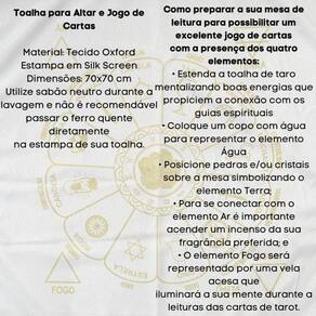 A Toalha Tecido Jogo de Cartas Cigana da Bialluz são ótimas para te auxiliar durante o jogo de cartas, por ser um elemento que proporciona alta elevação enérgica. Você também pode usar para decorar seu altar, com certeza ficara ainda mais lindo e com muita energia positiva. Nossa toalha possui altíssima qualidade na impressão com pontos de brilho e é confeccionada em tecido oxford que não amassa e tem longa durabilidade.