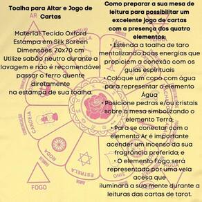 A Toalha Tecido Jogo de Cartas Cigana da Bialluz são ótimas para te auxiliar durante o jogo de cartas, por ser um elemento que proporciona alta elevação enérgica. Você também pode usar para decorar seu altar, com certeza ficara ainda mais lindo e com muita energia positiva. Nossa toalha possui altíssima qualidade na impressão com pontos de brilho e é confeccionada em tecido oxford que não amassa e tem longa durabilidade.