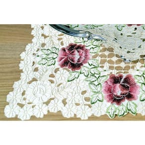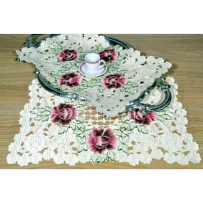 Toalha bandeja fabricada em tecido poliéster, na cor palha, com lindas rosas e folhas bordadas nas cores vinho, palha e verde. Detalhes em recortes e acabamento em bordado em toda lateral da toalha.