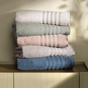 Da linha de Toalhas Premium Altenburg, o modelo Sense está disponível nos tamanhos rosto, banho e banhão com 5 opções de cores: bege, azul, cinza, rosa e branco.