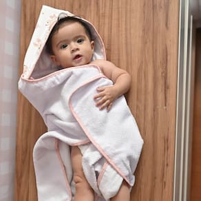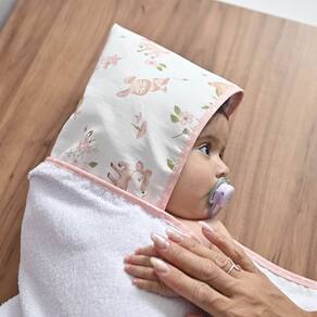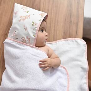 Características: - Medidas: 67 cm x 90 cm - Tecido: Felpa 100% Algodão - Capuz de Centro Estampa Digital - Acabamento: Viés - Forro: Fralda 100% Algodão - Forro Costurado nos 4 Lados - Marca: Bublim