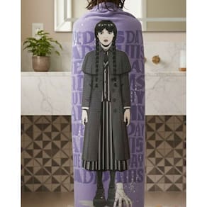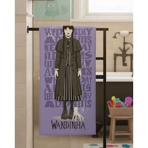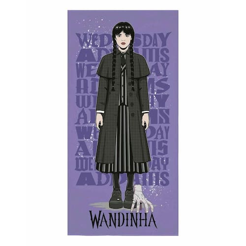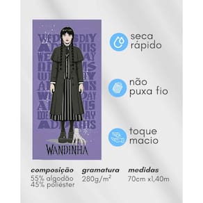 Transforme o momento do banho ou da praia em um instante de alegria e conforto com esta toalha aveludada estampada da personagem Wandinha.Com medidas de 70 cm × 1,40 m, ela oferece o tamanho perfeito para envolver-se com leveza ou estender confortavelmente. Produzida em 55% algodão e 45% poliéster, e com gramatura de 280 g/m², combina absorção eficaz, toque macio e acabamento que seca rapidamente, ideal para uso diário ou como item estiloso de suplementação da rotina. Além disso, o tecido resistente evita que puxe fios, preservando a qualidade e a estampa por mais tempo. A estampa da icônica Wandinha sai do seriado e leva o universo pop-gótico para o banho ou lazer. Marca: LepperMedidas: 70 cm (largura) × 1,40 m (comprimento)Composição: 55% algodão / 45% poliéstesGramatura: 280 g/m²Características: tecido aveludado, secagem rápida, não puxa fio, toque macioEstampa: personagem Wandinha (Família Adams)Se você quer uma peça que una design temático + qualidade para o dia a dia, essa toalha é a escolha certa.Enrole-se no mistério estiloso da Wandinha e torne o banho num momento digno de série!