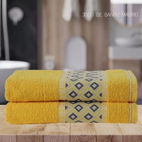 Com medidas aproximadas de 1,50m x 73cm, as toalhas de banho do Kit 02 Banhos Avulsos Madri Amarelo Ouro são perfeitas para envolver o corpo e proporcionar uma sensação de conforto após o banho.