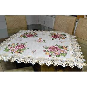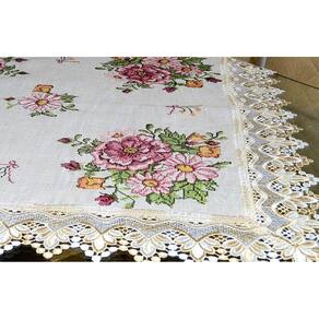 Toalha quadrada em tecido poliéster, na cor palha, com lindos bordados em ponto cruz de flores em tons de rosa, bege e branco e folhas verdes e acabamento em renda guipir em toda latera na cor bege e palha.