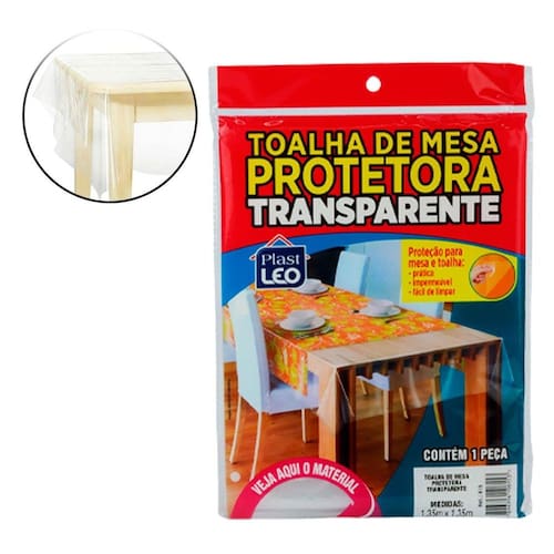 Toalha de Mesa 135x135cm Cristal Transparente Confeccionada em polietileno impermeável, fácil de limpar, sendo ideal para uso no dia a dia; Não passar, não utilizar produtos químicos, para limpar use sabão neutro com pano macio; Especificações:\nTamanho: 1,35 x 1,35m; Marca : PLAST LEO Tipo de material : Polietileno Cores ou Estampa : Transparente Dimensões do Produto : 135 X 135 X 0,5 CM Dimensões da Embalagem : 26 X 19 X 0,5 CM Peso Bruto (Gramas) : 0.110