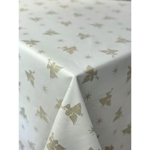 Toalha de mesa Anjos dourados produzida em Jacquard europeu de alta qualidade. Desenho com lurex dourado. Tudo para deixar a sua ceia de natal deslumbrante e encantadora