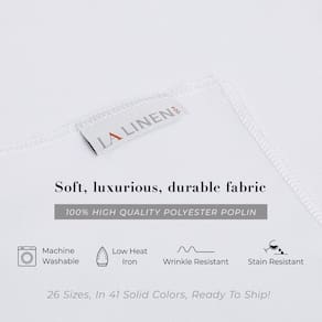 - Etiqueta LA Linen Care and Size para garantir qualidade e fácil identificação. Com jejum colorido, 7 onças de peso, o que o torna um dos tecidos mais duráveis para lençóis de eventos.