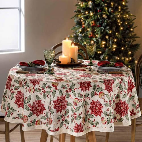 Marca: dohler Modelo: toalha de mesa natalina Composição: 50% algodão 50% poliéster Tamanho: 1,60 metros de diâmetro Gramatura: 170 gramas por metro quadrado Estampa: natal Cor: vermelho/cd