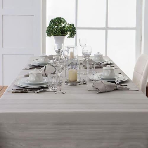 A Toalha de Mesa Retangular Panamá Strip possui o fundo cinza com listras e pertence à linha Limpeza Prática, com um acabamento hidrorepelente que facilita a limpeza e protege sua toalha contra líquidos, óleos, poeira e sujeira. O tratamento prolonga a vida útil da peça e garante a praticidade no dia a dia.