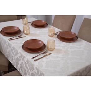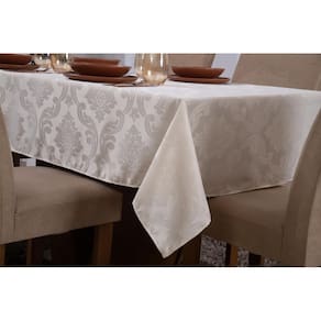 2. Qual o tecido da toalha de mesa? R: A toalha de mesa é feita em tecido jacquard, que confere sofisticação e durabilidade ao produto.