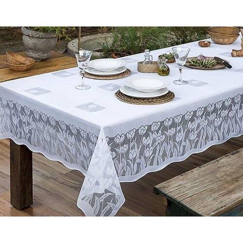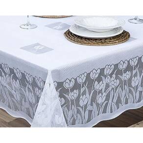 Linda toalha de mesa em renda com estampa de tulipas, super prática, não precisa passar, não amassam. Cor: Branco Composição: 100% Poliéster