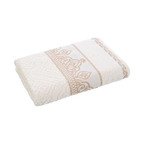 Toalha de rosto confeccionada em 100% algodão (exceto efeitos decorativos), com desenho em jacquard e acabamento com tingimento reativo, que contribui para melhor fixação da cor. Possui fio convencional de dupla torção, resultando em boa absorção e toque macio. O barrado decorativo contém fios metalizados em poliéster, conferindo um visual moderno.
