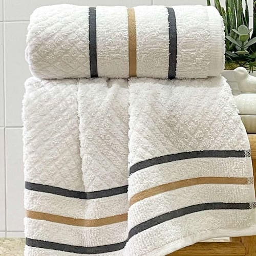 Barra Decorativa Moderna: Um Toque de EstiloAlém da funcionalidade, a Toalha Verona se destaca pelo design. Sua barra decorativa moderna é elegante e atual, agregando charme ao ambiente do banheiro. Essa atenção ao acabamento transforma uma peça do cotidiano em um verdadeiro item de decoração, combinando facilmente com diferentes estilos e deixando o ambiente mais acolhedor e bonito.