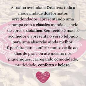Toalha Grande Praia Areia Redonda Casal Orla Lepper 1,55m Olá, amigas os A toalha aveludada Orla traz toda a modernidade dos formatos arredondados, apresentando uma estampa com o clássico símbolo da mandala, cheio de cores e detalhes. Seu tecido é macio, acolhedor e apresenta o verso felpudo para uma absorção ainda melhor.É perfeita para conferir muito estilo aos dias de praia ou até mesmo nos piqueniques, carregando comodidade, praticidade e conforto para curtir os momentos com o Jeito Lepper Marca: LepperLinha: HomeComposição:Lado de cima: AveludadaLado de baixo: Felpuda55% Algodão 45% Poliéster Tamanho: Grande - 1,50m x 1,50m Gramatura: 280g/m Dúvidas, estamos à disposiçãoBoas compras :