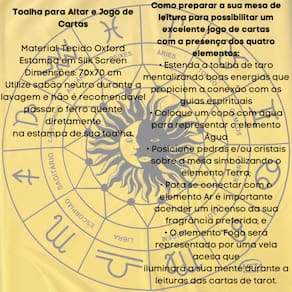 A Toalha Jogo de Cartas Zodíaco da Bialluz é ótima para te auxiliar durante o jogo de cartas, por ser um elemento que proporciona alta elevação enérgica. Você também pode usar para decorar seu altar, com certeza ficara ainda mais lindo e com muita energia positiva. Nossa toalha possui altíssima qualidade na impressão com pontos de brilho e é confeccionada em tecido oxford que não amassa e tem longa durabilidade.