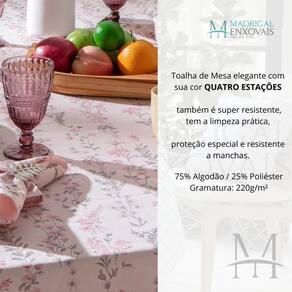 Contém: 01 peça 01 toalha de mesa redonda 1,80m Estampa/cor: quatro estações/rosa