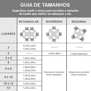 ACONSELHAMOS QUE TIRE AS MEDIDAS DA SUA MESA PARA ESCOLHER O TAMANHO QUE MELHOR SE ADEQUARÁ A ELA.