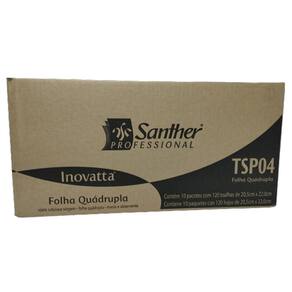 Toalha de papel santher folha quadrupla interfolha 1200 folhas toalha para mãos interfolhada folha quádrupla inovatta tecnologia ponto a ponto tsp 04 característica do produto este produto é produzido com 100% fibras virgens celulose não transgênicas. Possui excelente alvura e maciez, bem como boas propriedades de resistência ao estado úmido e exclusiva tecnologia ponta a ponto que deixa o papel muito mais macio e mais absorvente. Não causa irritações dérmicas. Código tsp04 -toalha interfolhada fq santher inovatta
