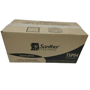 Toalha de papel santher folha quadrupla interfolha 1200 folhas toalha para mãos interfolhada folha quádrupla inovatta tecnologia ponto a ponto tsp 04 característica do produto este produto é produzido com 100% fibras virgens celulose não transgênicas. Possui excelente alvura e maciez, bem como boas propriedades de resistência ao estado úmido e exclusiva tecnologia ponta a ponto que deixa o papel muito mais macio e mais absorvente. Não causa irritações dérmicas. Código tsp04 -toalha interfolhada fq santher inovatta