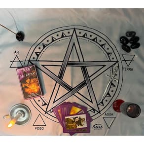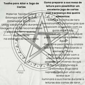 A Toalha Tecido Jogo de Cartas Pentagrama da Bialluz são ótimas para te auxiliar durante o jogo de cartas, por ser um elemento que proporciona alta elevação enérgica. Você também pode usar para decorar seu altar, com certeza ficara ainda mais lindo e com muita energia positiva. Nossa toalha possui altíssima qualidade na impressão com pontos de brilho e é confeccionada em tecido oxford que não amassa e tem longa durabilidade.