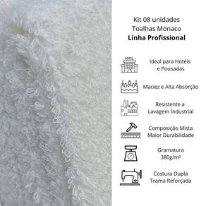 Características: - Kit com 08 peças de toalhas de banho profiline mônaco - Tamanho: 0,70x1,35m - Alta absorção e maciez - Resistência à lavagem industrial e ao cloro - Gramatura: 380g/m - Cor: branca - Composição: 90% algodão / 10% poliéster
