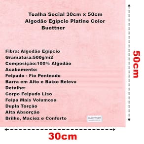 Toalha Social Buettner Platine Algodão Egípcio Color 30x50cm Rosa Toalha Social (Lavabo) felpuda, 100% Algodão Egípcio no tamanho 30cm x 50cm com 500g/m da linha Nobre e da marca Bouton, modelo Platine, produzida em teares especiais que possibilitam desenvolver desenhos tanto no corpo quanto nas barras das toalhas. A toalha Platine possui corpo liso com bastante felpa e uma barra discreta e suave com linhas horizontais, apenas para dar um charme ao expor ela. Seu corpo liso possui alta absorção, e sua barra minimalista possui detalhes horizontais, destacando um tom de charme e nobreza, proporcionando uma linda exposição no banheiro, traduzindo refinamento e muita sofisticação ao ambiente. Suas cores buscam remeter aos tons nobres da estação. Toalha Social Buettner Platine Algodão Egípcio Color 30x50cm Rosa Pétala