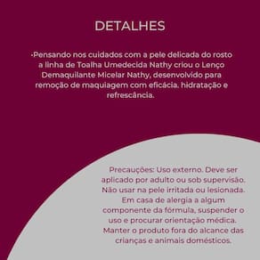 Lenço Demaquilante Micelar 24 UND. Pensando nos cuidados com a pele delicada do resto a linha de Toalha Umedecida Nathy criou o Lenço Demaquilante Micelar Nathy, desenvolvido para remoção de maquiagem com eficácia, hidratação e refrescância. Modo de Usar: Lava bem as mãos antes de manusear o produto: 1- Abra a etiqueta autoadesiva no local indicado; 2- Retire a primeira toalinha puxando pelo centro; 3- Utilize a toalinha no local desejado; 4- Após o uso, feche a etiqueta autoadesiva. Precauções: Uso externo. Deve ser aplicado por adulto ou sob supervisão. Não usar na pele irritada ou lesionada. Em caso de alergia a algum componente da fórmula, suspender o uso e procurar orientação médica. Evitar o contato com os olhos, se houver contato, lave com água em abundância. Não ingerir. Manter o produto fora do alcance das crianças e animais domésticos. Recomendações: Mantenha a embalagem bem fechada, em lugar seco, fresco e ao abrigo da luz solar. Composição: Aqua / Água. Disodium EDTA / EDTA Dissódico. PEG-40 Hidrogenated Castor Oil / Óleo de rícino hidrogenado. Disodium cocoamphodiacetate / Cocoanfodiacetato díssodico. Hexylene Glycol / Hexilenoglicol, Benzyl Alcohol / Alcool Benzílico. Características: Medidas: Profundidade: 20cm Largura: 9cm Ean: 7898136151443