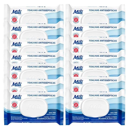 Embalagem com 14 pacotes de 50 unidades, totalizando 700 toalhas Experimente a praticidade aliada à segurança com as Toalhas Umedecidas Mili Antissépticas.